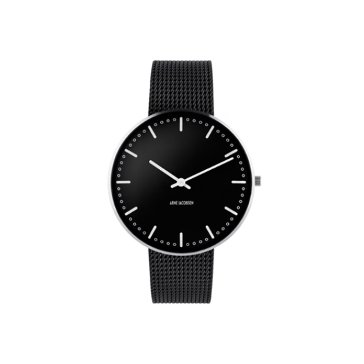 Arne Jacobsen – City Hall Ur – Ø40 – Sort skive, sort mesh lænke, IP sortbørstet topring