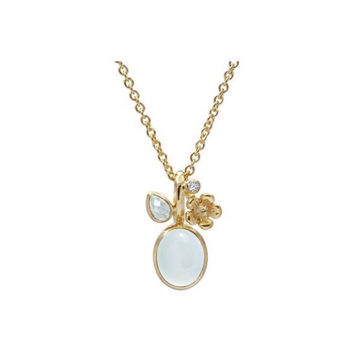 En smuk og enkel halskæde med et vedhæng der indeholder en smuk mint farvet calcedon, en hydro aquamarin og to hvide topazer. Stenenes farver spiller utrolig fint sammen med fatningens guld.Vedhænget er af forgyldt sølv og i vedhænget sidder en smuk calce (Læs mere)